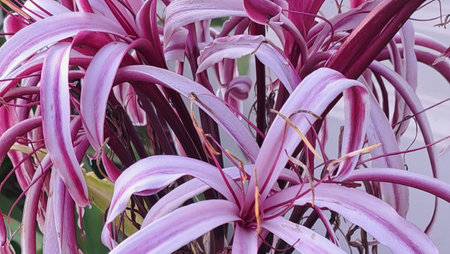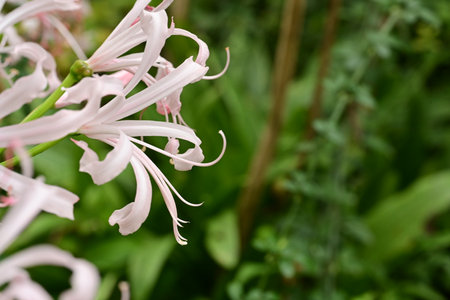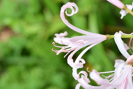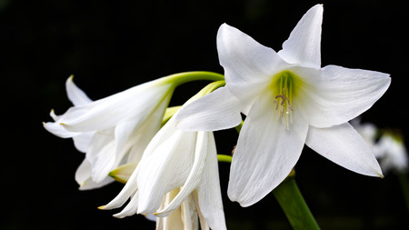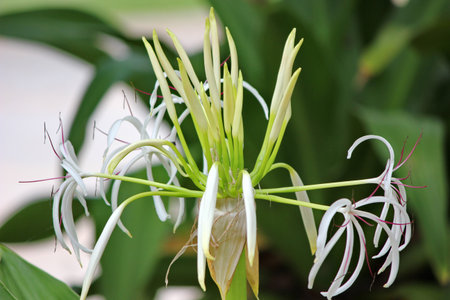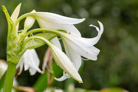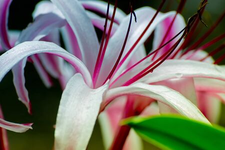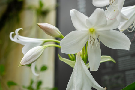 Asian Crinum blooming, white flowers closeup, abstract nature background