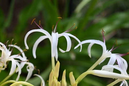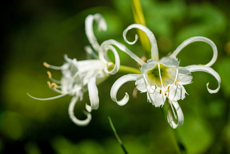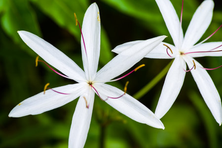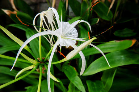 Close-up of elegant white spider lily flowers in full bloom amidst lush green foliage. The delicate petals and bright orange stamens create a striking contrast, highlighting the natural beauty and intricate details of this exotic tropical plant.