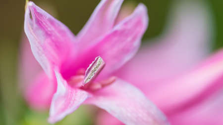 vibrant pink mexican lily flower close up reveals soft petals, a green center, and golden pollen on the stamens. Perfect for nature, botanical, and macro detail in stock collections. Hippeastrum reginae