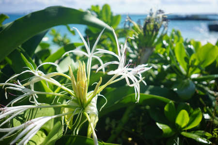 White flowers of tephra lily and blue sea in Miyako Island, a remote island in Okinawa Prefecture