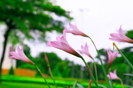 Rain Lily flowers (Fairy Lily, zephyranthes spp) blooming in garden