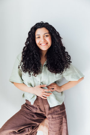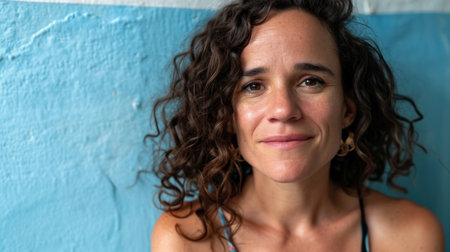 A young woman with curly brown hair stands in front of a brightly painted wall, smiling brightly.