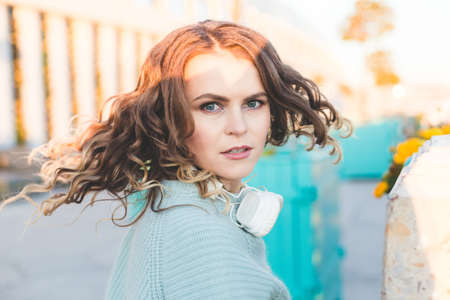 fashion portrait of young beautiful, fashionable, curly girl in headphones walks through the city. Joyful emotions on the face, smile, happiness. Beautiful smile with perfect white teeth.