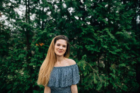 Closeup portrait of attractive girl in casual clothes on green forest background looking into camera with serious face. Pretty tourist girl in gray sweater posing on blurred forest background.