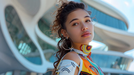 A captivating portrait of a confident young woman showcasing artistic apparel. The unique design and striking lighting create a powerful visual impact, embodying style and individuality.