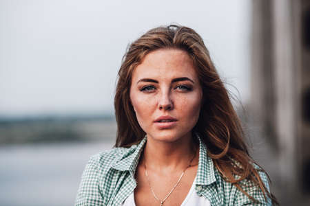Beautiful young stylish ginger woman with freckles. Fashion portrait of charming girl wearing casual clothes posing at home. Passion
