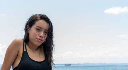 Young woman or pretty girl with adorable face, on black background. Natural beauty