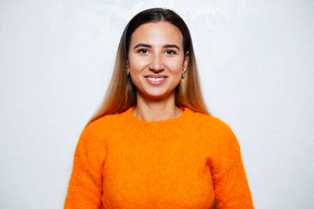 Studio portrait of young brunette smiling girl wearing orange sweater on background of white color.