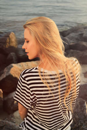 Beautiful young woman on the beach at sunset. Beauty, fashion.