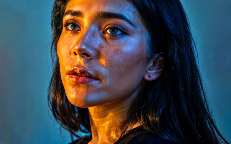 photo of beautiful woman with mixed red and blue lighting , generative AI