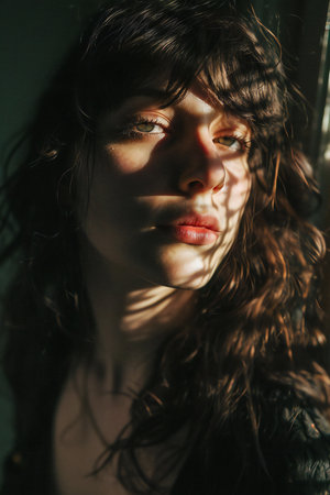 A stunning portrait of a young woman with flowing hair, reflecting natural light. Her serene expression captures a moment of confidence and authenticity.
