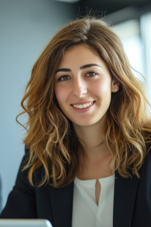 Focused Female Professional Smiling and Working on Digital Device