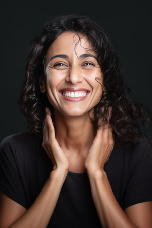 Close up portrait of happy young woman with hands in curly hair