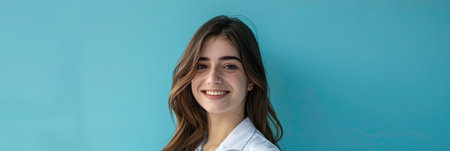 banner, portrait of a young African American woman doctor in a white coat, smiling brunette doctor, blue background, poster, copy space, free space for text