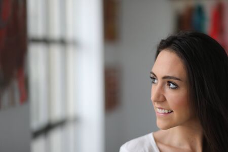 young brunette woman by the sea, copy space
