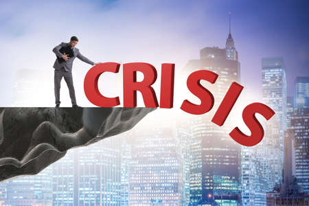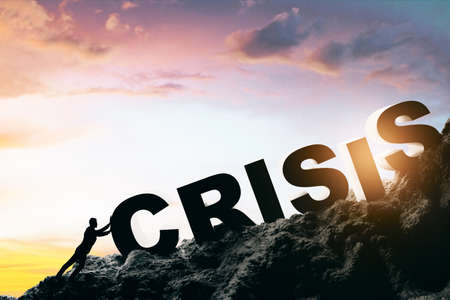 Crisis and personal problem concept with man trying to get up big sign crisis on the rock at sunset background