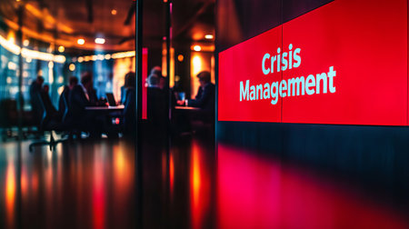 A team engages in a crisis management meeting, with a focus on a large screen display in a modern boardroom, highlighting strategic discussions.