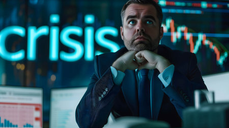 serious businessman or investor and sign crisis on stock market background, worry about loss money and reccession, black swan theory