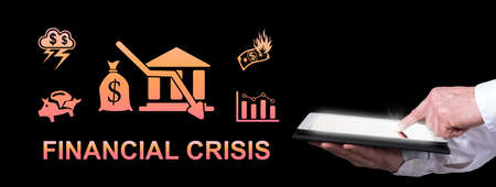 Phrase Financial Crisis and pink arrows in different directions on black background. Financial crisis concept.