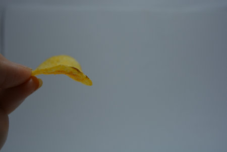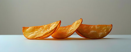 Potato chips standing alone on a clean white surface. Concept Food Photography, Still Life, Snack Time, Monochrome Aesthetics, Minimalist Composition