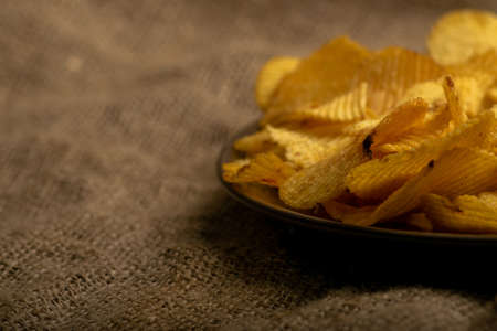 Fluted potato chips on a background of homespun fabric with a rough texture. Close up
