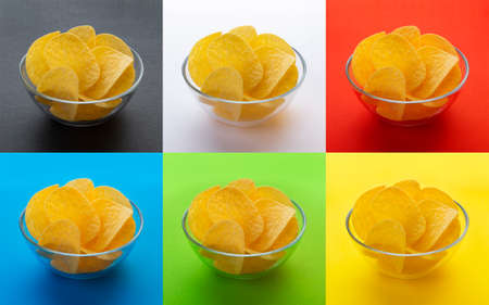 Potato chips in bowl isolated on different backgrounds, collection