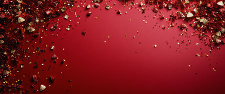 Glimmering gold and silver confetti scatter across a bright red surface, creating an atmosphere of joy and festivity. The sparkles catch the light, enhancing the celebratory mood.