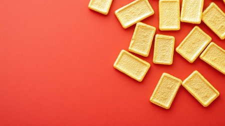 A collection of golden rectangular bars resting on a vibrant red background. These bars symbolize wealth and luxury, making them ideal for creative designs or financial concepts.