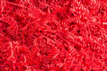 A close-up shot of a bed of cut and crimped red paper package filling strips.