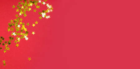 Golden star confetti on red background. Greeting card for Christmas, New Year and birthday. Banner. Copyspace.