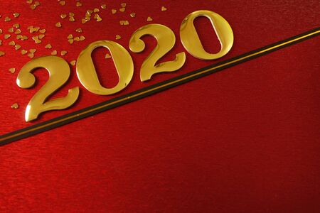 Golden 2020 on trendy Christmas red shiny blurred background. Flat lay style.