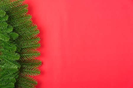 Happy new year or christmas day top view flat lay fir tree branches on red background with copy space for your text
