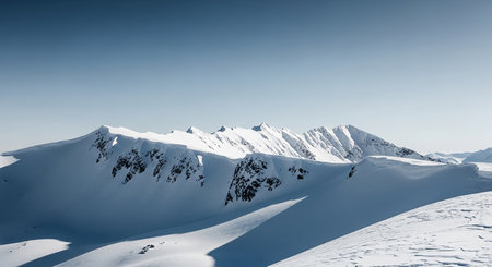 Majestic mountains blanketed in snow stand tall against a clear blue sky. The scene captures a serene winter landscape, perfect for nature lovers and outdoor enthusiasts.