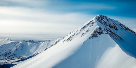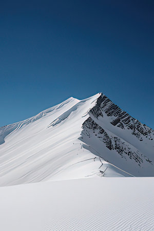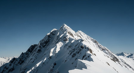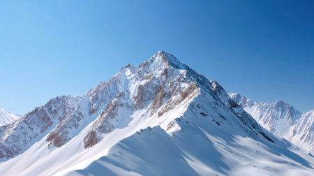 Majestic Snow Covered Mountain Peak Against Clear Blue Sky Capturing Tranquil Winter Landscape Beauty and Serene Wilderness.