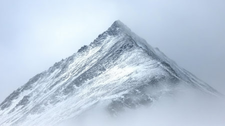 This striking image features a snow-capped mountain peak shrouded in fog and clouds, creating a serene and mysterious winter landscape that evokes a sense of adventure and tranquility.