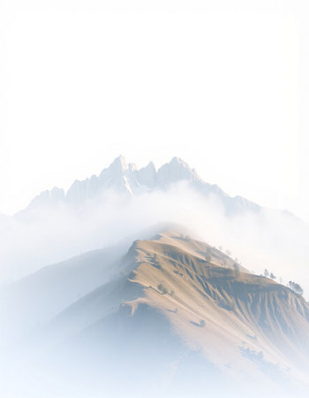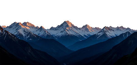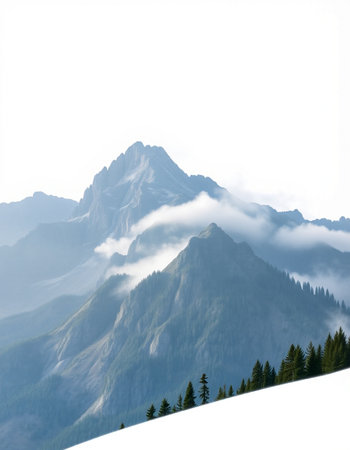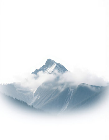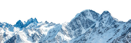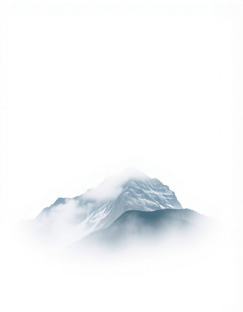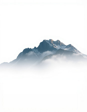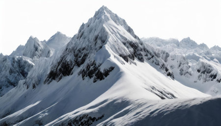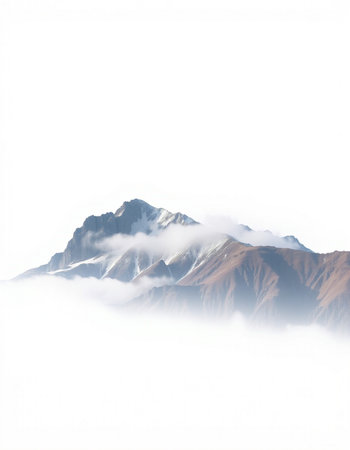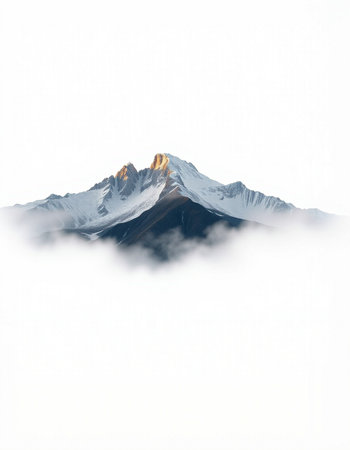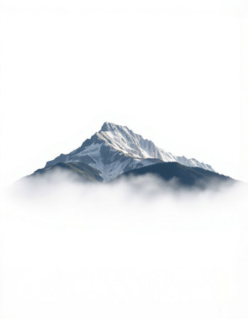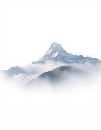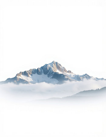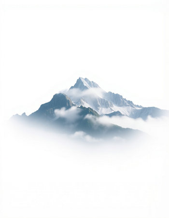 A stunning depiction of a snow-capped mountain peak set against a clean white background. The image highlights the mountains striking contours and serene beauty, ideal for diverse uses like
