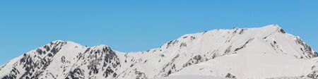extreme horizontal picture of mountain landscape with snow and blue sky, blue background copy space
