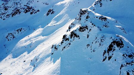 Aerial view of the Alps mountains in France. Mountain tops covered in snow. Alpine ski facilities from above.