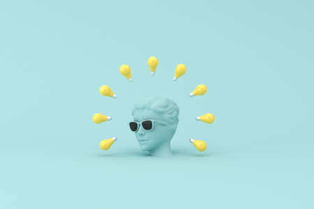Minimal scene of sunglasses and headphone on human head sculpture with light bulbs, 3d rendering.