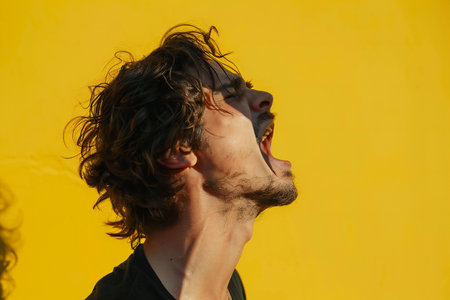 Portrait of a young man on a yellow background. The guy is screaming.