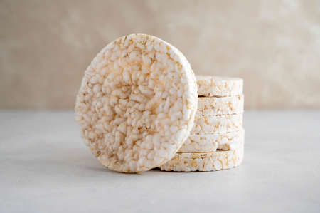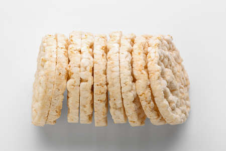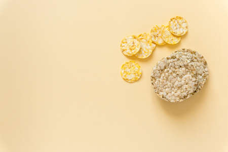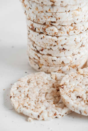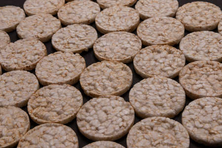 Pile of puffed rice cakes. Crunchy crispbread, bright background
