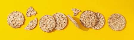 Puffed rice bars (kozinaki) on yellow background, flat lay
