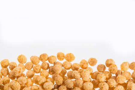 Detail of a snack based on flavored cheese puff, with corn flour and hydrogenated fats.
