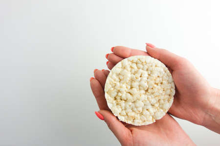 Female hand holding rice cracker. Fit diet, healthy food concept. White background with copy space for your design