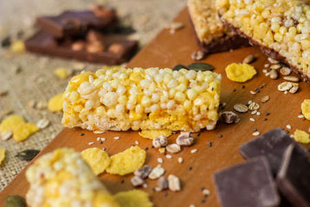 Various Healthy Cereal Granola Energy Protein Bar on Salem Background, Top View