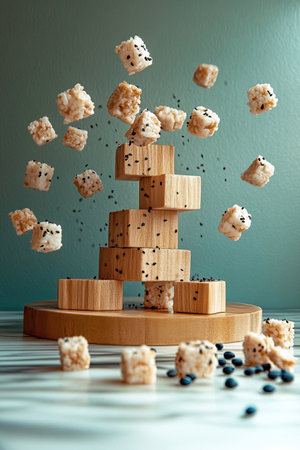 Sushi pieces in the air above a wooden tower create an artistic composition against a solid backdrop.