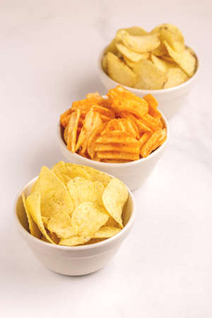 Three sorts of crispy and corrugated potato chips in bowl on light marble background. Junk food. Copy space