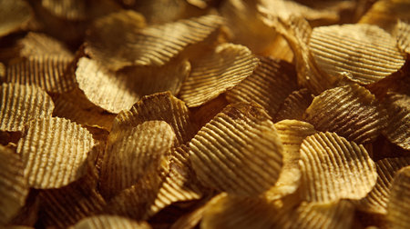 a macro image of a texture of freshly cooked yellow crispy potato chips. Close up. filling the frame.