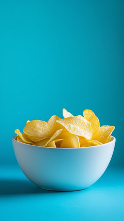 A vibrant bowl of golden potato chips against a bright blue background, perfect for snacking at home or a party