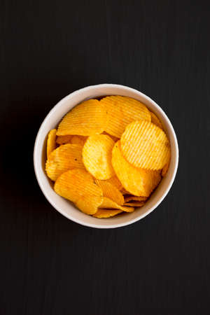 Ruffled Cheese Potato Chips in a Bowl on a black surface, top view. Flat lay, overhead, from above.